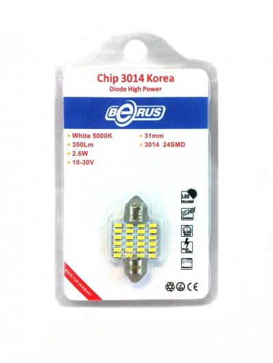 Светодиодная софитная лампа 1031 2.6W предназначена для освещения салона. Состоит из 24 ярких диодов. Лампа намного ярче обычных галогеновых, отлично освещает дорогу ночью и  в дождливую погоду. Цвет свечения со временем не изменяется. Служит такая лампа очень долго, при этом потребляет незначительное количество энергии.
