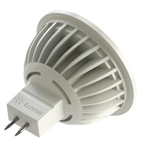 Светодиодная лампа Ecomir GU5.3 3W эквивалентна галогеновой лампе мощностью 25 Вт с цоколем MR16. Потребляемая мощность – всего 3 Вт, цветовая температура – 3000 К (это желтый свет). Световой поток — 260 лм. Напряжение — 220 В. Матовый рассеиватель. Угол освещения > 90°.