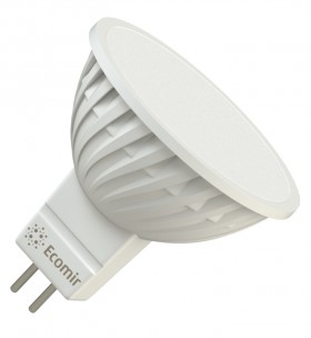 Светодиодная лампа Ecomir GU5.3 4W эквивалентна галогеновой лампе мощностью 35 Вт с цоколем MR16. Потребляемая мощность – всего 4 Вт, цветовая температура – 3000 К (это желтый свет). Световой поток — 300 лм. Напряжение — 220 В. Матовый рассеиватель. Угол освещения > 90°.