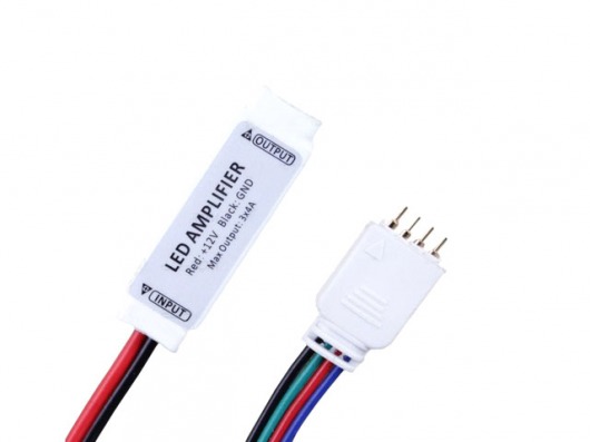 Компактный RGB усилитель A mini позволит "разгрузить" RGB контроллер. Т.е. если мощность необходимого метража ленты превышает допустимую мощность контроллера, то к нему можно подключить усилитель. Таким образом, вы можете подсоединить до 20 метров дополнительной светодиодной ленты.