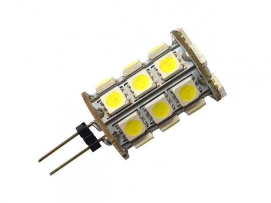 Светодиодная лампа G4/27-5050 с 27 светодиодами SMD 5050 и напряжением 10-30V — это отличная альтернатива галогенным лампам и лампам накаливания с цоколем G4. Яркость данной лампы составляет 12-15 Лм на 1 диод. Цвет свечения лампы — холодный белый.