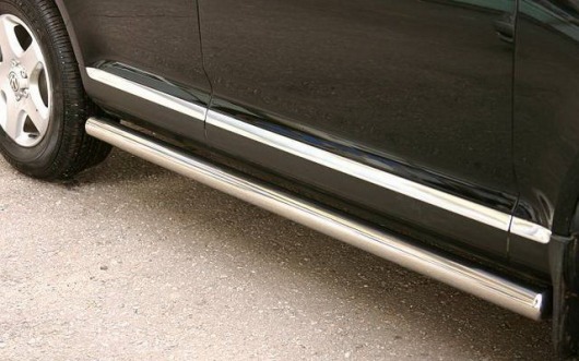 Боковые пороги-подножки сделаны специально для автомобилей Volkswagen Touareg 2006-2009 г.в., поэтому устанавливаются достаточно просто и без повреждений корпуса. Помимо этого, стальные пороги-трубы для Фольксваген Туарег смотрятся очень стильно и эффектно. Они добавят вашему авто еще больше солидности и внушительности.
