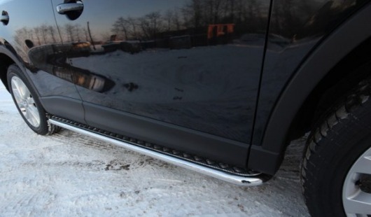 Пороги на Mazda CX-5 – это боковые подножки из нержавеющей стали диаметром 42 мм, которые позволяют более комфортно входить и выходить из салона автомобиля. Подножки Mazda CX-5 очень прочные, надежные и долговечные: они не боятся коррозии, сколов и царапин и выдерживают большие нагрузки.