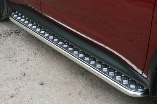 Боковые пороги-подножки сделаны специально для автомобилей Nissan Juke 4x4 от 2011 г.в., поэтому устанавливаются достаточно просто и без повреждений корпуса. Помимо этого, стальные пороги с листом для Ниссан Жук 4x4 смотрятся очень стильно и эффектно. Они добавят вашему авто еще больше солидности и внушительности.