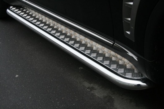 Боковые пороги-подножки сделаны специально для автомобилей Infiniti FX 35 и FX 50 от 2008 г.в., поэтому устанавливаются достаточно просто и без повреждений корпуса. Помимо этого, стальные пороги с листом для Инфинити FX 35, FX 50 смотрятся очень стильно и эффектно. Они добавят вашему авто еще больше солидности и внушительности.