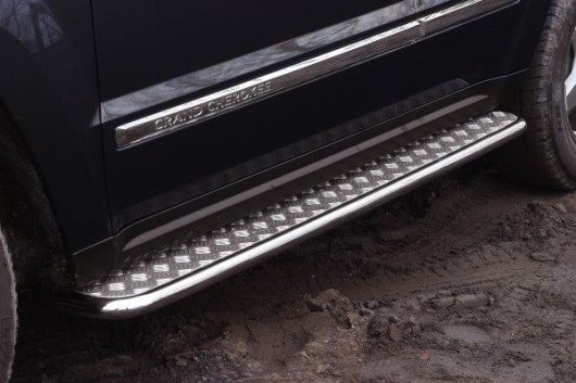 Боковые пороги-подножки сделаны специально для автомобилей Jeep Grand Cherokee от 2005 г.в., поэтому устанавливаются достаточно просто и без повреждений корпуса. Помимо этого, стальные пороги с листом для Джип Гранд Чероки смотрятся очень стильно и эффектно. Они добавят вашему авто еще больше солидности и внушительности.