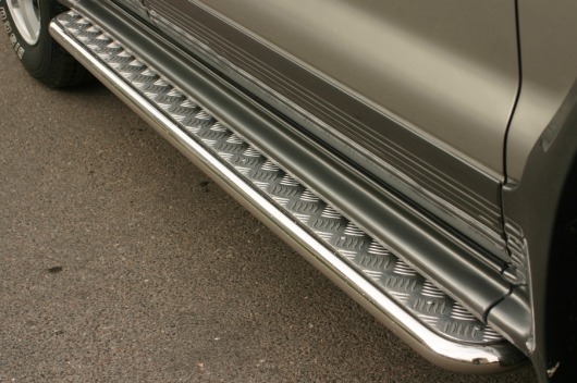 Боковые пороги-подножки сделаны специально для автомобилей Kia Sportage от 1999 г.в., поэтому устанавливаются достаточно просто и без повреждений корпуса. Помимо этого, стальные пороги с листом для Киа Спортейдж смотрятся очень стильно и эффектно. Они добавят вашему авто еще больше солидности и внушительности.