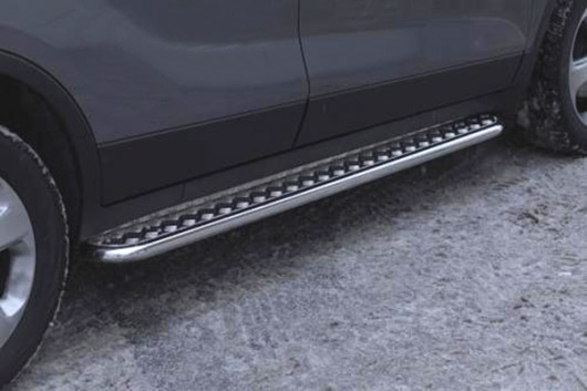 Боковые пороги-подножки сделаны специально для автомобилей Opel Mokka от 2012 г.в., поэтому устанавливаются достаточно просто и без повреждений корпуса. Помимо этого, стальные пороги с листом для Опель Мокка смотрятся очень стильно и эффектно. Они добавят вашему авто еще больше солидности и внушительности.