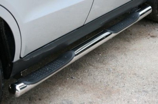 Боковые пороги-подножки сделаны специально для автомобилей Hyundai Santa Fe от 2013 г.в., поэтому устанавливаются достаточно просто и без повреждений корпуса. Помимо этого, стальные пороги с проступями для Хендай Санта Фе смотрятся очень стильно и эффектно. Они добавят вашему авто еще больше солидности и внушительности.