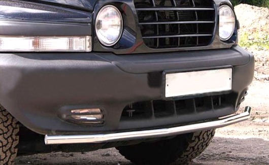Защита переднего бампера труба предназначена для автомобилей ТагАЗ Tager. Вам не придется подгонять защиту под размеры бампера вашего авто. И с монтажом проблем не возникнет: установка защиты переднего бампера производится в штатные отверстия, а значит, необходимость сверлить кузов отпадает.