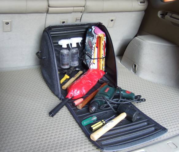 Этот автомобильный органайзер средних размеров —  44 х 39 х 35 см, но Вы можете хранить в нем немало нужных вежей. Вы можете положить туда и набор автохимии, и буксировочный тросс, и щетку-сметку для снега со скребком и много других полезных предметов.
