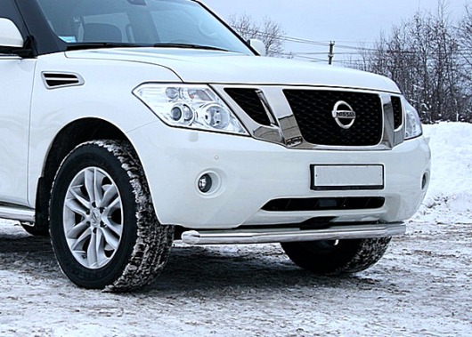 Защита переднего бампера труба предназначена для автомобилей Nissan Patrol от 2010 г.в. Вам не придется подгонять защиту под размеры бампера вашего авто. И с монтажом проблем не возникнет: установка защиты переднего бампера производится в штатные отверстия, а значит, необходимость сверлить кузов отпадает.