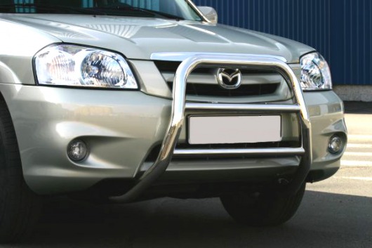 Передняя решетка Mazda Tribute (кенгурятник) – это защитная дуга на бампер из нержавеющей стали диаметром 60 мм.