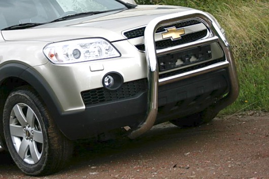 Передняя решетка Chevrolet Captiva (кенгурятник) – это защитная дуга на бампер из нержавеющей стали диаметром 76 мм.