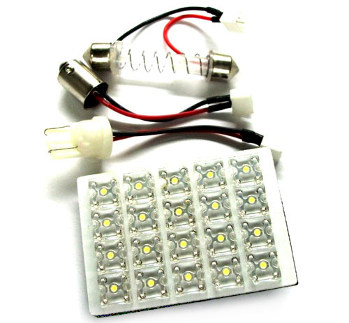 идет в комплекте с 3 переходниками под разные цоколи ламп, устанавливается в салон и исзлучает холодный белый свет.