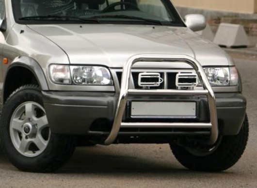 Защитная решетка переднего бампера предназначена для автомобилей Kia Sportage от 1999 г.в. Вам не придется подгонять передний кенгурятник под размеры кузова вашего авто. И с монтажом проблем не возникнет: установка кенгурятника Kia Sportage производится в штатные отверстия, а значит, необходимость сверлить кузов отпадает.