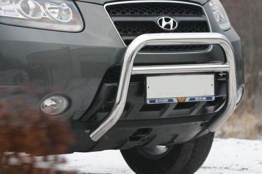 Передняя решетка Hyundai Santa Fe (кенгурятник) – это защитная дуга на бампер из нержавеющей стали диаметром 60 мм.