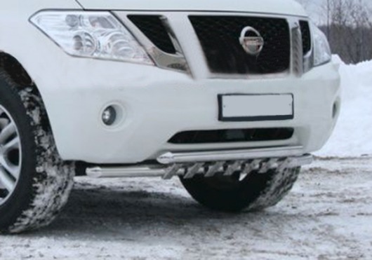 Защита переднего бампера труба с профильными элементами предназначена для автомобилей Nissan Patrol от 2010 г.в. Вам не придется подгонять защиту под размеры бампера вашего авто. И с монтажом проблем не возникнет: установка защиты переднего бампера производится в штатные отверстия, а значит, необходимость сверлить кузов отпадает.