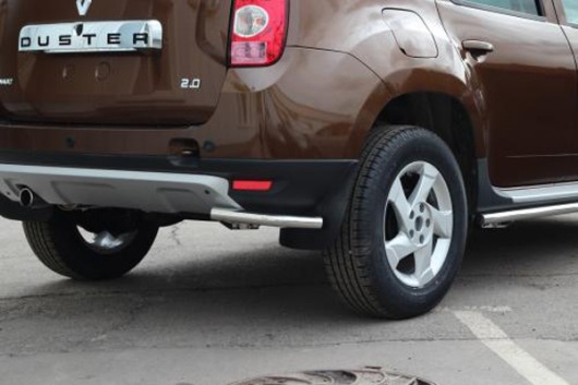 Защита заднего бампера для Renault Duster – это защитные уголки на бампер из нержавеющей стали диаметром 42 мм.