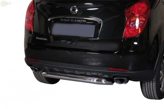 Труба на задний бампер SsangYong Actyon защищает задний бампер автомобиля от различных механических повреждений при столкновениях на дороге и неудачных парковках. А кроме этого, ступень на задний бампер для Санг Енг — это еще и деталь тюнинга, а также дополнительная подножка для авто. Красиво и практично.