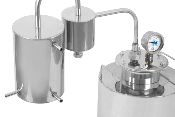 Высокое качество и чистота продукта. Сухопарник — это небольшая емкость, которая устанавливается между основным баком и змеевиком. Она проводит дополнительную очистку, отфильтровывает сивушные масла, тяжелые спирты и примеси и исключает попадание браги в готовый напиток. Так что сомневаться в качестве и чистоте продукта вам не придется.