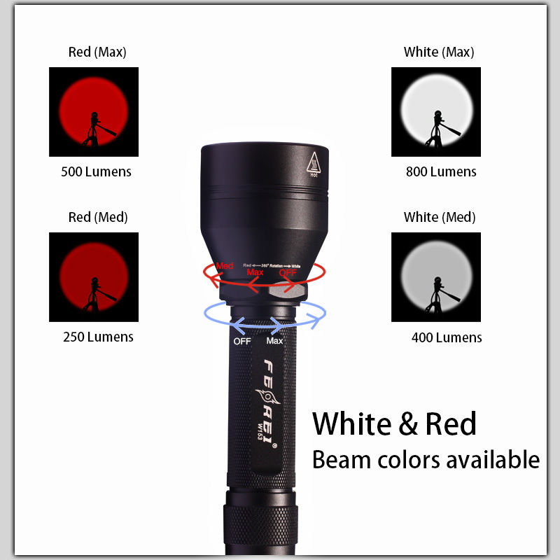 Главной особенностью фонаря для подводной охоты и дайвинга Ferei W153 является наличие сразу 3 светодиодов! Один из них (CREE XM-L) светит холодным белым светом, два других (CREE XP-E) – красным. Мощность также различна. К примеру, белый светодиод обладает мощностью 800 лм, а красные – 500. Тем самым, белый вариант подходит, если вы оказались в не слишком прозрачной воде, а красный прекрасно показывает себя там, где нужно сберечь ресурс аккумулятора. На каждом из диодов имеется по 2 режима яркости.