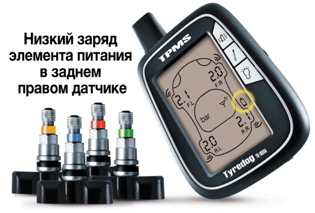 • Отображение не только температуры/давления в колесах, но и предупреждения о низком напряжении бортовой сети, а также низком заряде элемента питания.