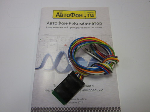 Контроллер Автофон Рекомбинатор имеет 2 входа и 1 выход для плюсовых и минусовых сигналов. Каждый вход реагирует и на положительный, и на отрицательный потенциал электросети автомобиля. Поэтому к каждому входу подключены 2 провода. Активный выход устройства обеспечивает током 1А одновременно положительный и отрицательный потенциал от оранжевого и зеленого проводов.