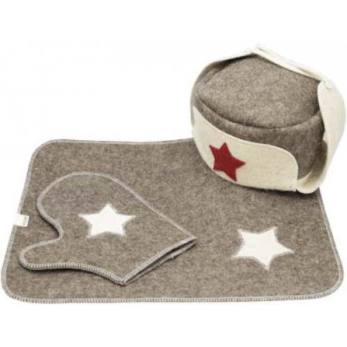 В набор банных принадлежностей входит специальная войлочная рукавичка, которая поможет очистить поры вашего тела от грязи и шлаков, а также улучшит кровообращение во всем теле, что окажет благоприятное воздействие на весь организм в целом. Кроме того, в комплект входит мягкий удобный войлочный коврик, которым застилают лежанку. Таким образом, купив комплект для сауны "Ушанка" вы сделаете свои походы в сауну более комфортными.