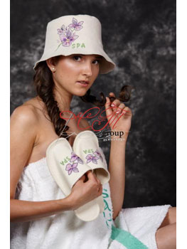 Комплект для сауны "Орхидея", включающий в себя тапочки и шапку из натурального материала — превосходный для любой любительницы сауны. Колпак и тапочки выполнены в стильном, нежном дизайне и понравятся любой представительнице слабого пола.