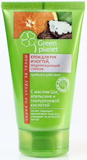 Крем для рук и ногтей, предупреждающий старение, тройного действия (Зеленая планета) питает и защищает нежную кожу рук, увлажняет кутикулу ногтей, омолаживает и слегка осветляет кожу, предотвращает шелушение и делает кожу нежной и гладкой. Подходит для смягчения очень сухой кожи на локтях и коленях.