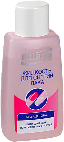 Жидкость для снятия лака без ацетона (Rilana) эффективно удаляет лак, одновременно защищая ваши ногти. Подходит для искусственных ногтей, не содержит ацетона.