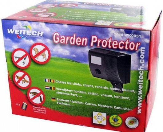 Отпугиватель Weitech WK0051 излучает ультразвуковой сигнал различной мощности и частоты, который не воспринимается человеком, но слышим животными. Такой сигнал вызывает тревогу, страх и желание покинуть место его распространения. Прибор работает стационарно: устанавливается рядом с тем объектом, который нужно защитить. Как только в поле "видения" появляется животное, отпугиватель автоматически активизируется. Это происходит благодаря встроенному ИК-датчику движения.