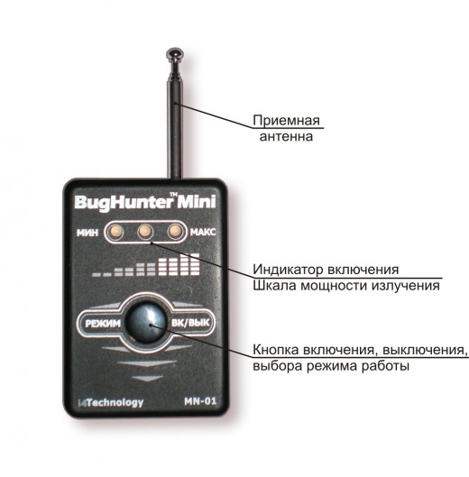 • Выдвижная внешняя антенна, которая позволяет регулировать чувствительность прибора и обнаруживать низкочастотные "жучки".