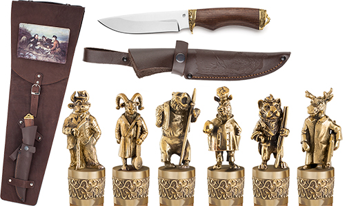 Все шампуры хранятся в оригинальном чехле из натуральной кожи, который украшен репродукцией знаменитой картины Перова "Охотники на привале" и внешне напоминает колчан для стрел.