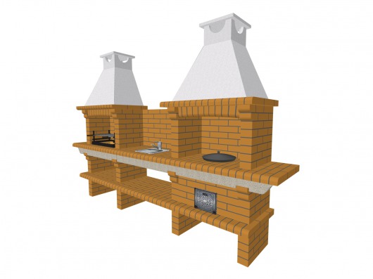 Садовая печь-барбекю из натурального кирпича Saunday 734 — лучший выбор для больших семей. Эта модель комплектуется стальным мангалом и плитой, так что вы сможете готовить 2 блюда одновременно: одно на решетке, шампурах или вертеле, другое в сковороде, казане или даже в коптильне (коптильня приобретается отдельно). Плюс к этому, печка снабжена кирпичной столешницей со встроенной мойкой, так что перед вами — полноценная садовая кухня.