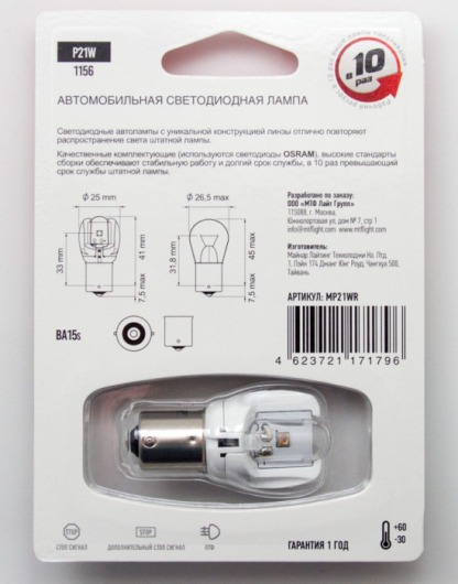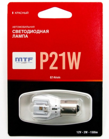Использование лампы MTF P21W является наиболее оптимальным решением, так как срок ее службы в 10 раз превышает срок службы штатной лампы. Также светодиодные лампы обладают максимальным КПД в сравнении с аналогичными, что составляет порядка 80%.