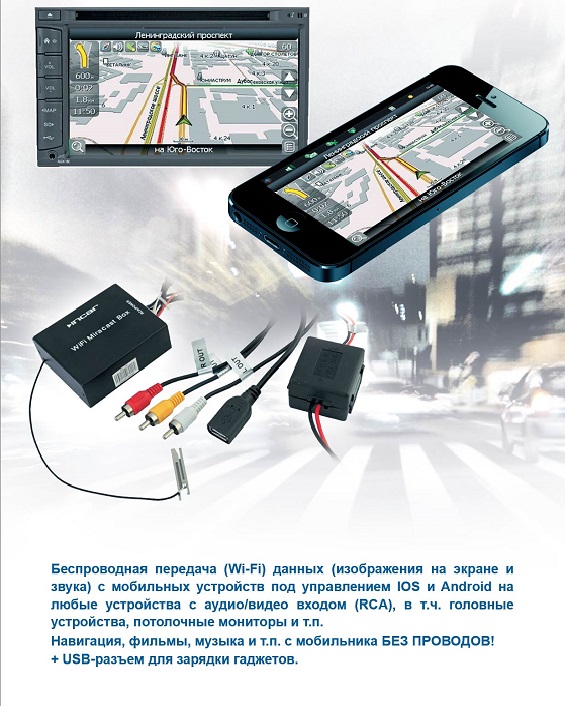 Предназначен для передачи данных по Wi-Fi с мобильных устройств на операционных системах IOS, Android на головные устройства автомобиля. Возможно использование навигации, видео, интернета, игр, видео, музыки, находящихся на внешнем устройстве.