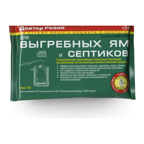 Культуры почвенные в спорах, входящие в состав Доктор Робик 109 способны в течение короткого времени утилизировать бумагу, фекалии, жиры, белки, целлюлозу, мочевину, крахмал. Ежемесячное применение позволит избежать заиливания пор в земле, образования окаменелостей и нерастворимых органических отложений в септиках и выгребных ямах. Благодаря своей формуле Доктор Робик 109 ускоряет естественные биологические процессы разложения. Один пакетик (75 г.) рассчитан на 30-40 дней для резервуара 1500 литров.