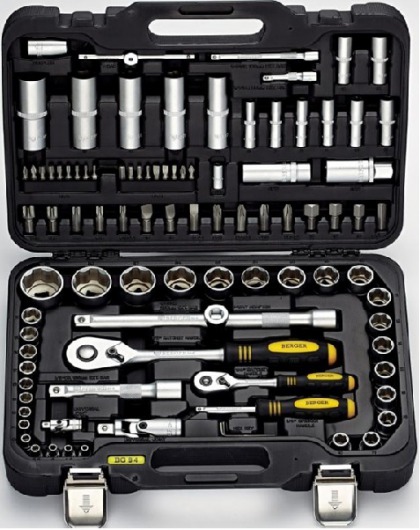 BERGER BG094-1214 — это набор инструментов в чемодане, в котором собрано 94 предмета — все самое необходимое для каждого автолюбителя. Набор инструментов для автомобиля BERGER BG094-1214 содержит следующие предметы: ключ-трещотку, торцевые и свечные головки, различные биты, а также многое другое, благодаря чему вы можете сделать мелкий ремонт своего авто самостоятельно. Этим вы экономите свое личное время и деньги.