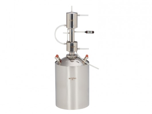 В комплектацию входит: перегонный куб на 20 литров с горловиной диаметром 7,5 см, два сухопарника с холодильником, термометр, гарантийный талон, коробка, инструкция по сборке.