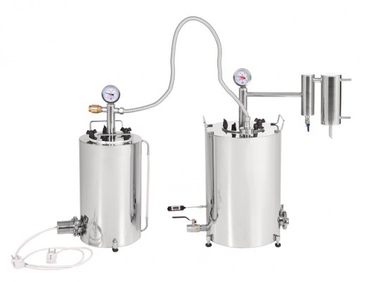 С помощью этого аппарата можно сварить густое зерновое сусло. В этом же баке происходит бражение сусла, и его последующая перегонка. Использование в качестве нагрева пара исключает пригорание густого сусла.