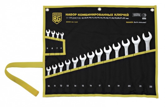 BERGER BG-17SCW — это набор комбинированных гаечных ключей, состоящий из 17 инструментов  – от 6 до 22 мм. Комбинированные ключи BERGER BG-17SCW хранятся в удобном чехле, в котором все ключи расположены строго по размеру.