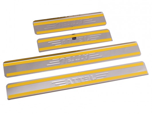 Накладки на металлические пороги дверей Volkswagen Jetta с логотипом авто не только обеспечивают защиту верхней и боковой поверхности внутреннего порога, но и отлично вписываются в интерьер автомобиля, подчеркивая его стиль и индивидуальность. C монтажом проблем не возникнет: установка накладок на внутренний порог для Фольксваген Джетта производится на штатные места с помощью скотча 3M.