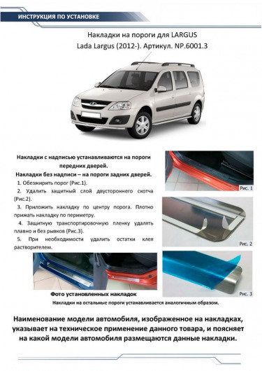 Данные накладки на внутренние пороги «Риваль» разработаны специально для автомобилей LADA Largus от 2012 г.в. и полностью повторяют их геометрию. Кроме того, накладки порогов двери Rival очень легко и быстро устанавливаются. И при этом надежно крепятся за счет плотного прилегания морозостойкого скотча.