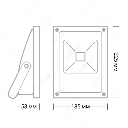 Размеры led прожектора — 225 × 185 × 53 мм. Данная модель рассчитана на напряжение 220 В. Мощность диодного прожектора X-Flash — 30 Вт., яркость — 2600 Лм, а температура свечения 6500 K (это белый с синим оттенком свет).