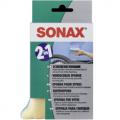 Губка для стекла Sonax 417 100 имеет две стороны. Желтая изготовлена из замши (протирание запотевшего или влажного стекла). Голубая – из мягкой фланели, которая пропита антизапотевающим составом.